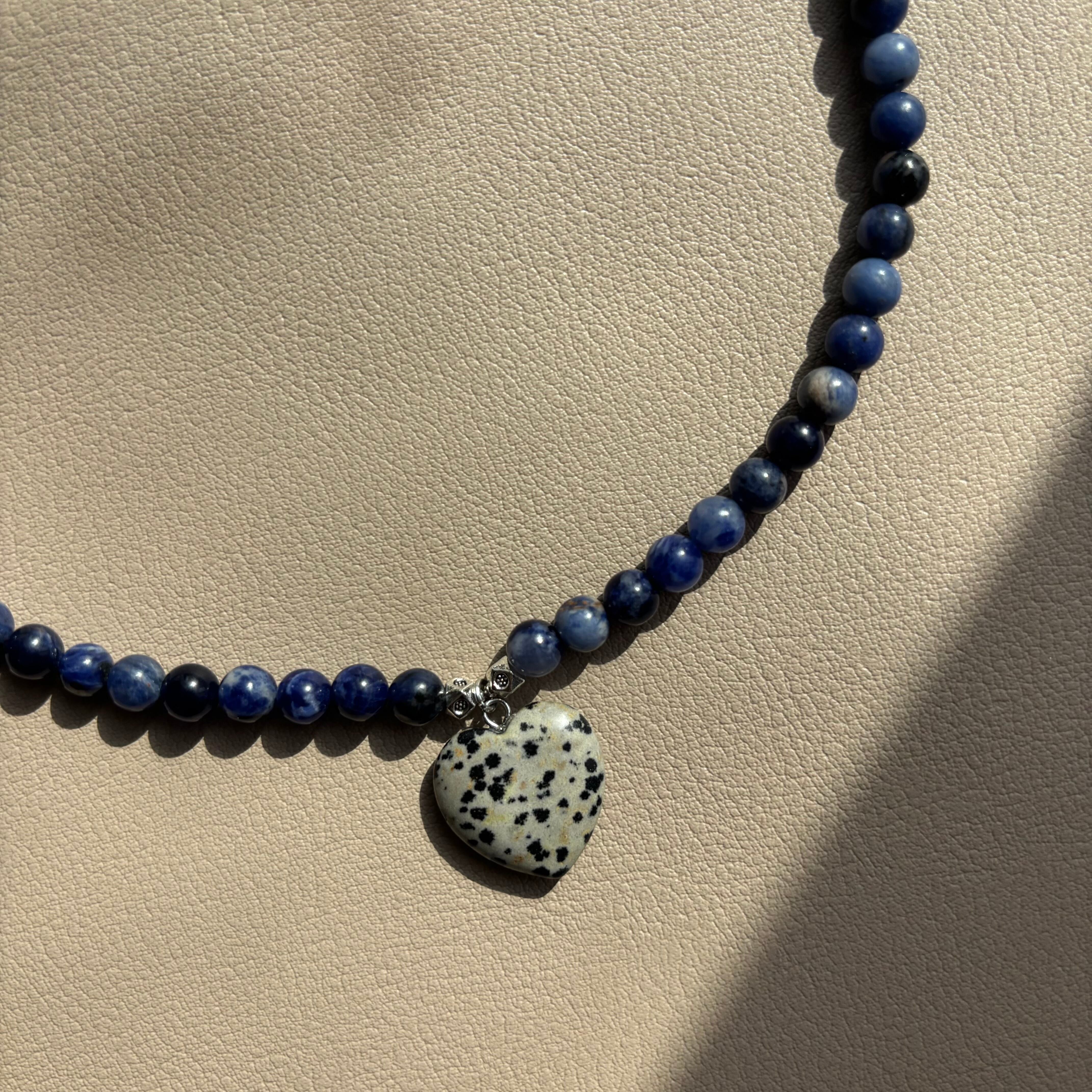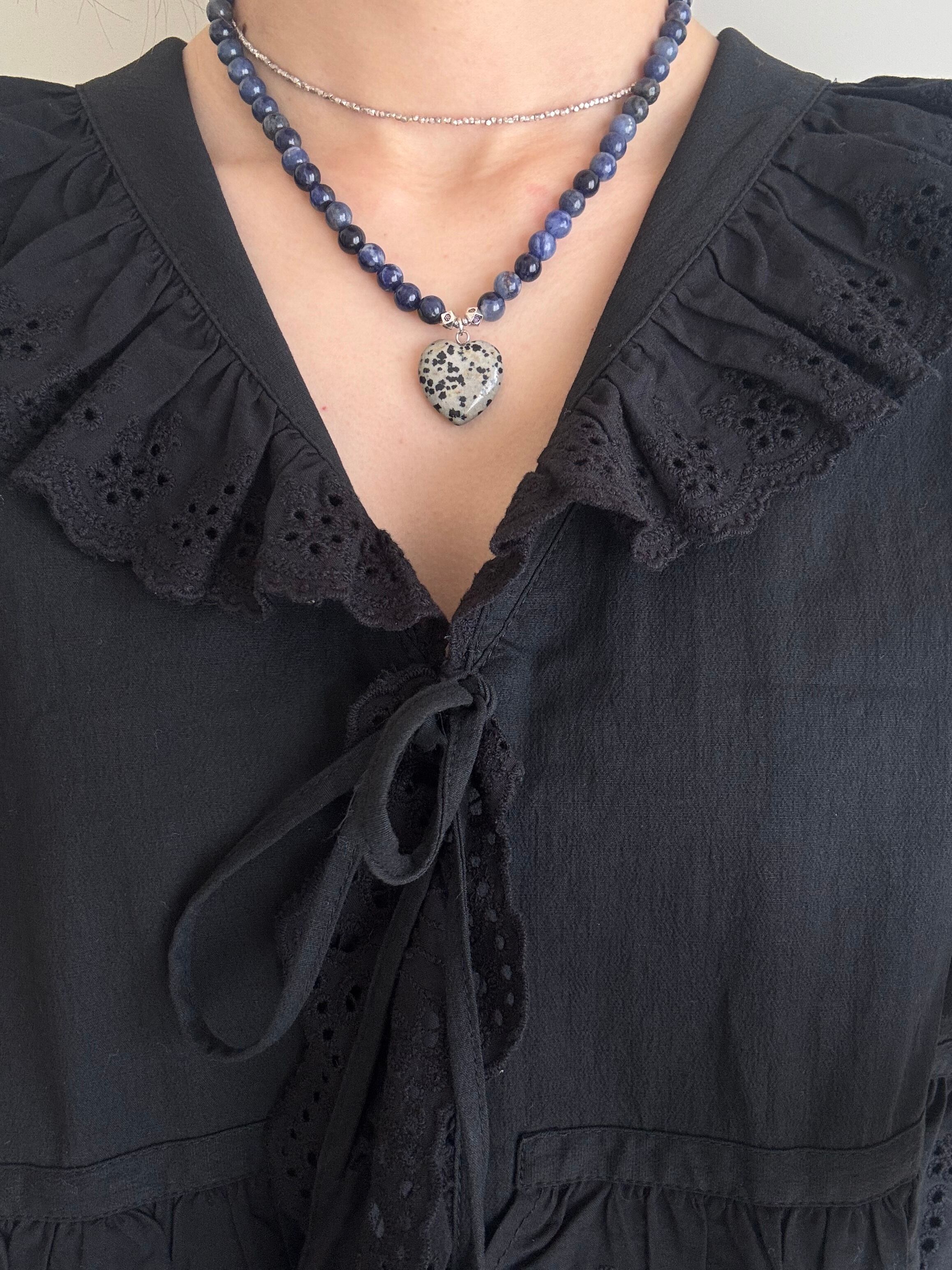 少しグレーがかったハートの大きめチャームとブルーのお石を合わせて、しっかりと存在感あるネックレスをお作りしました!