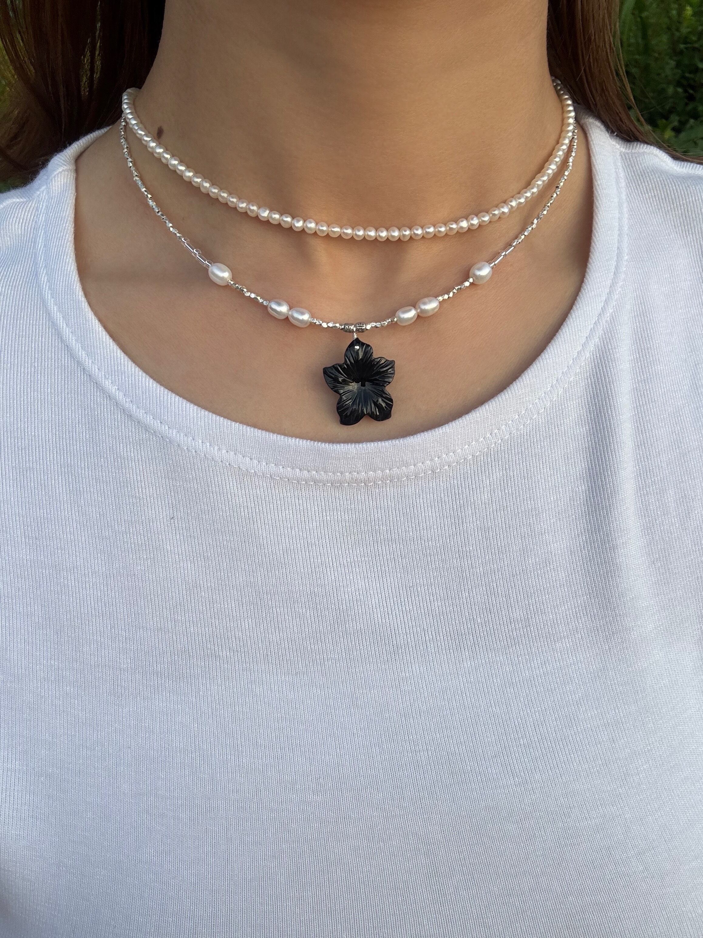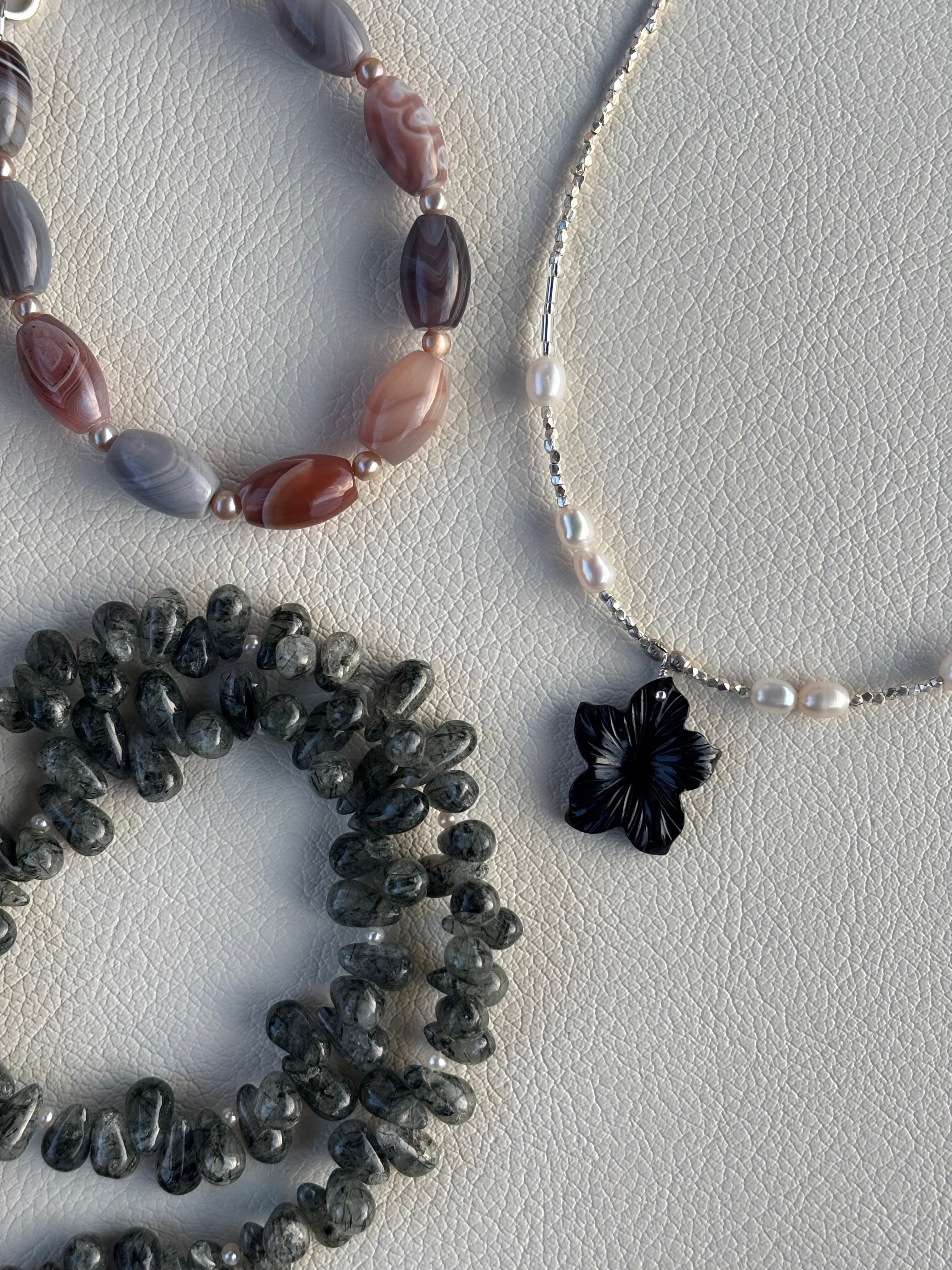 お花型にカットされたオニキスペンダントトップとsilverを合わせ、上品かつ個性的に仕上げました