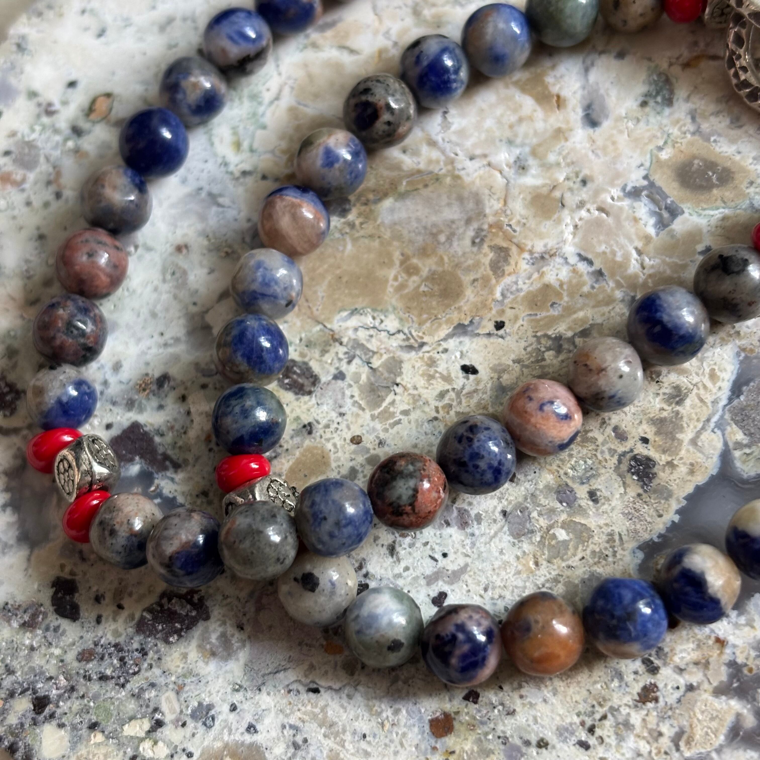 青や赤、グレーがバランスよく入ったネックレスとなっております!